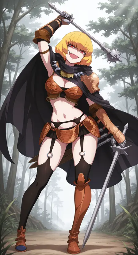 铠甲比基尼(带斗篷):clementinegirlbikiniarmor, black_cloak, hooded_cloak, shoulder_armor, pauldron, bracer, gauntlets, claws, black_garter_belt, black_skirt, miniskirt, faulds, sheath, sheathed, holding_mace, holding_stiletto, stiletto\(weapon\), multiple_weapons, black_thighhighs, o-ring_legwear, armored_boots, single_knee_boot