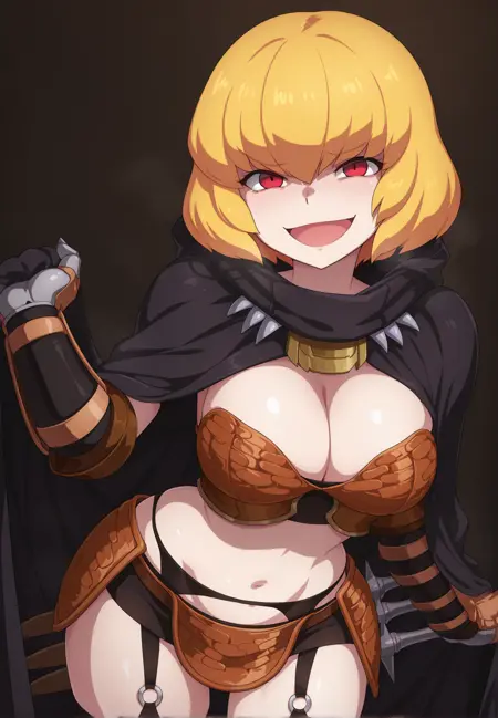 갑옷 비키니 (검집 포함): clementinegirlbikiniarmor, criss-cross_halter, shoulder_armor, pauldrons, bracer, gauntlets, claws, black_garter_belt, black_skirt, miniskirt, faulds, sheath, sheathed, mace_on_belt, stiletto_(weapon), multiple_weapons, black_thighhighs, o-ring_legwear, armored_boots, single_knee_boot