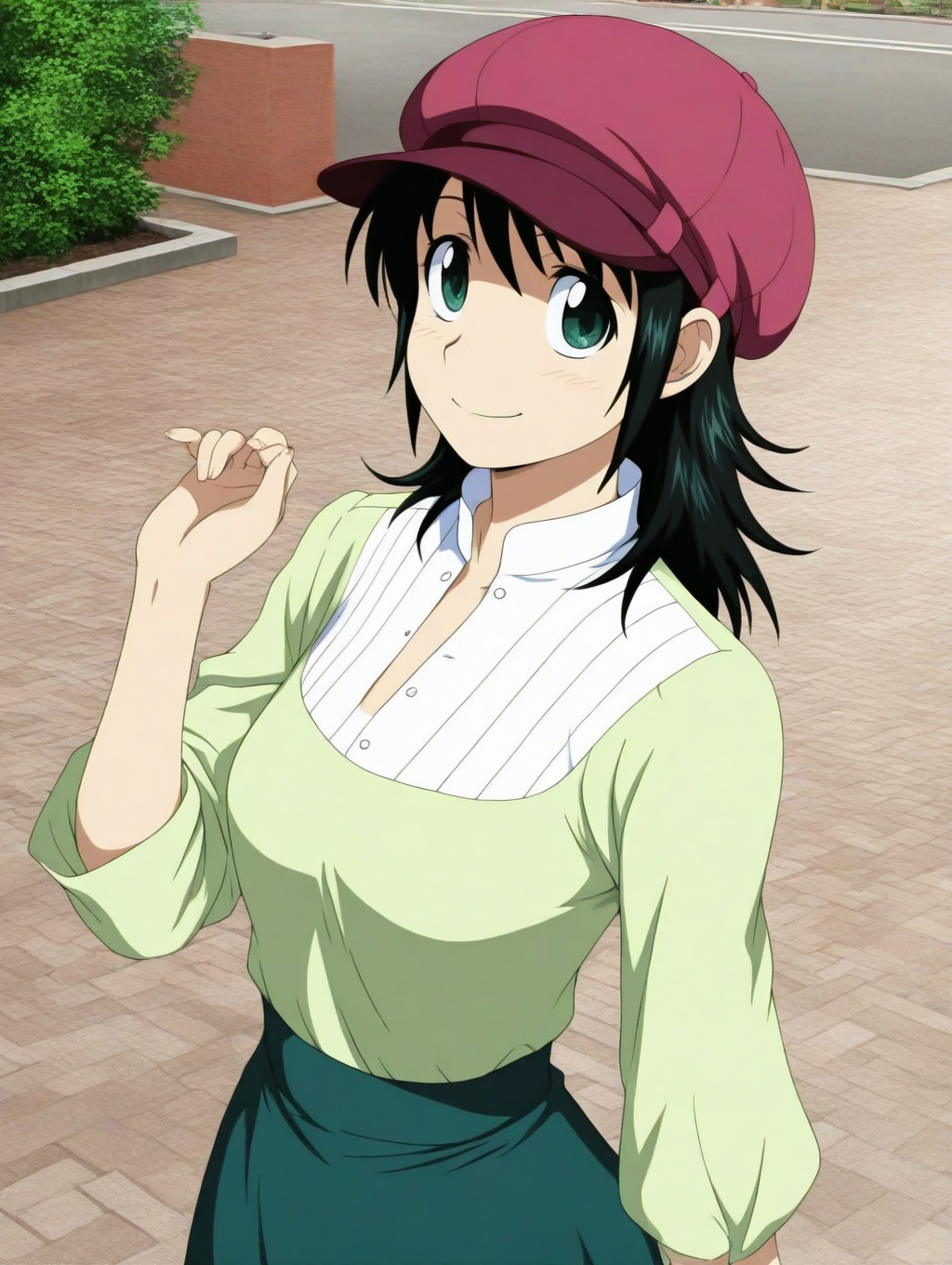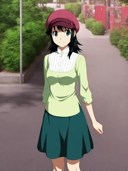 服装2:赤い帽子、キャビハット、緑のトップス、白いマンダリンカラー、緑のスカート