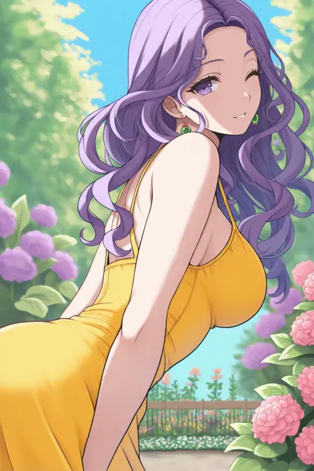 트리거 단어는 "ff2m"이며, "보라색 머리, 긴 머리, 곱슬머리, 보라색 눈"이 필수입니다.
