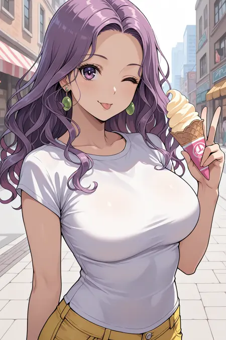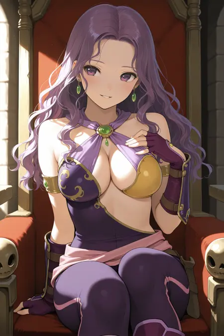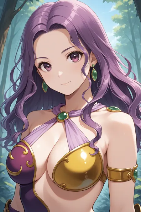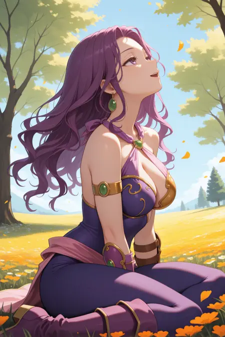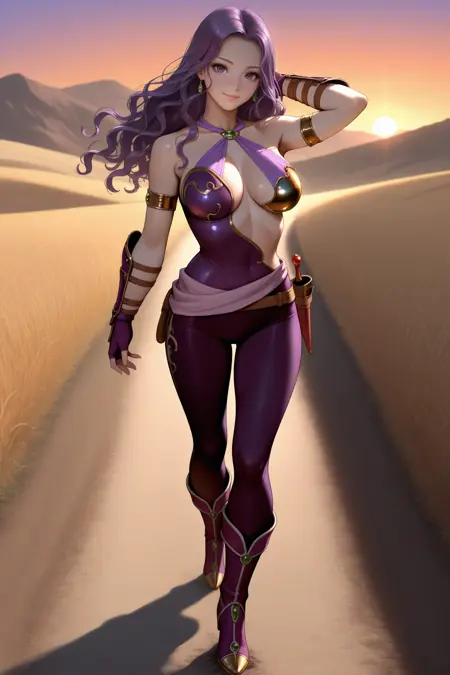 그녀의 전형적인 외모를 위해 "귀걸이, 비대칭 옷, 어깨 노출, 하탈넥, 십자 하탈넥, 가슴 노출, 보라색 바디수트, 팔찌, 보라색 레깅스, 팔 보호대, 손가락 없는 장갑, 보라색 장갑, 보라색 부츠"를 추가하세요.