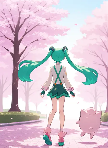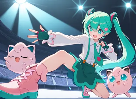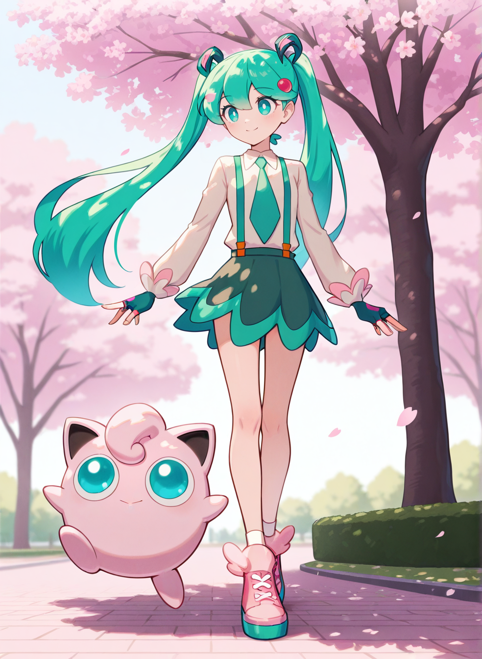 outfit: 绿发,绿色领结,无指手套,白衬衫,长袖,背带裙,粉鞋