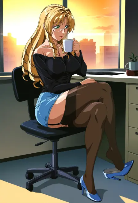 黒シャツ、青スカート、ペンシルスカート、黒タイツ、青い靴、ハイヒール、パンプス、ガーターストラップ