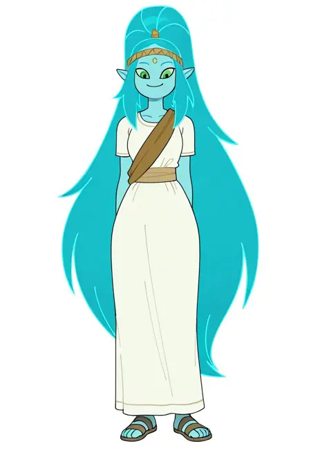 タグ: canyonILL, 長い髪、色付きの肌、緑の目、尖った耳、青い肌、青い髪、ポニーテール、非常に長い髪、水色の髪、サンダル、額のジュエリー、白いドレス、ヘアバンド、高いポニーテール