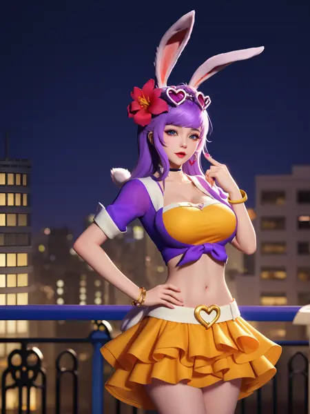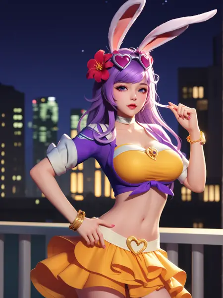 - WZRYgongsunliMJZX, 1girl, solo, rabbit ears, skirt, long hair, jewelry, hair flower, purple hair, midriff, breasts, blue eyes, bracelet, navel, choker, lips, heart-shaped eyewear, looking at viewer, cityscape, night, mature female, hand on hip,