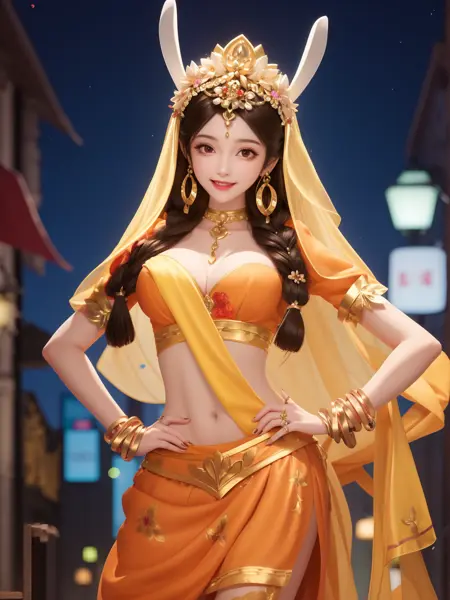 - WZRYgongsunliYTGZ, 1girl, jewelry, bracelet, long hair, hair ornament, solo,rabbit ears, smile, braid, ring, brown hair,hair flower, looking at viewer, veil, brown eyes, floral print, choker, earrings, dress, forehead jewel, cityscape, night,mature female, navel,hand on hip,