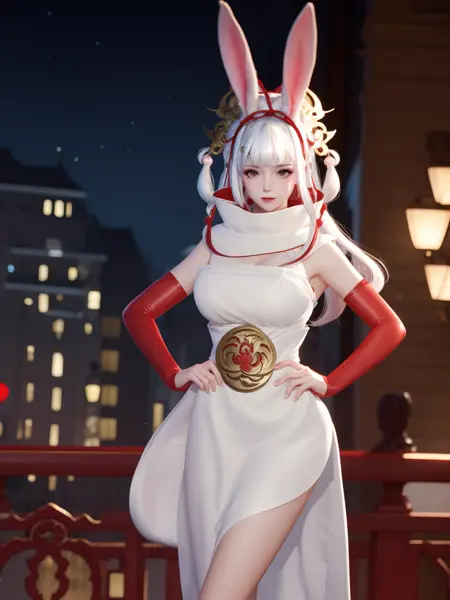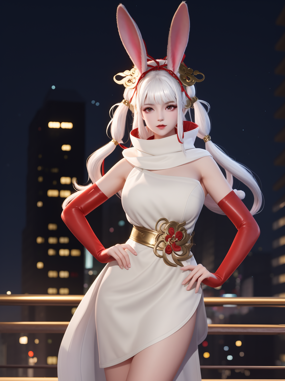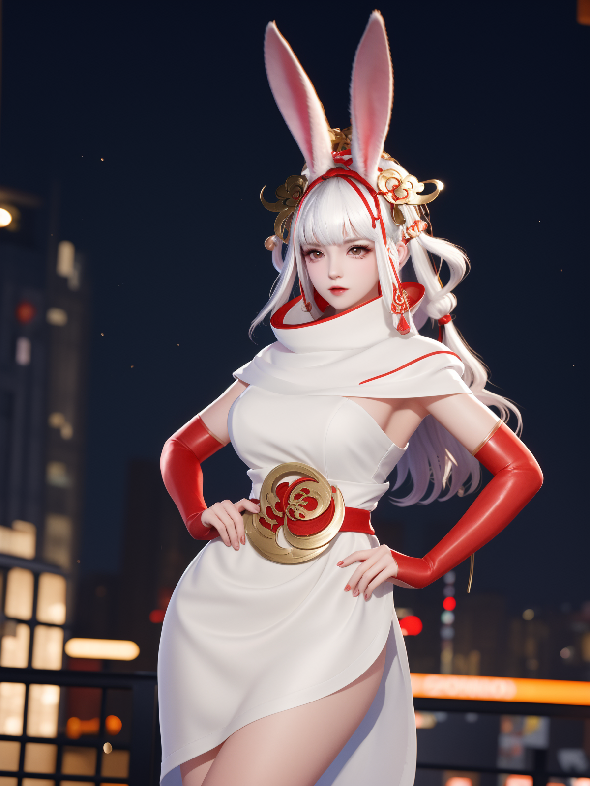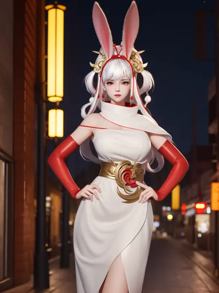 - WZRYgongsunliQXLZ, 1girl, solo, white hair, rabbit ears, long hair, looking at viewer, hair ornament, red eyes, makeup, elbow gloves, jewelry, cityscape, night, mature female, standing, hand on hip, cowboy shot,