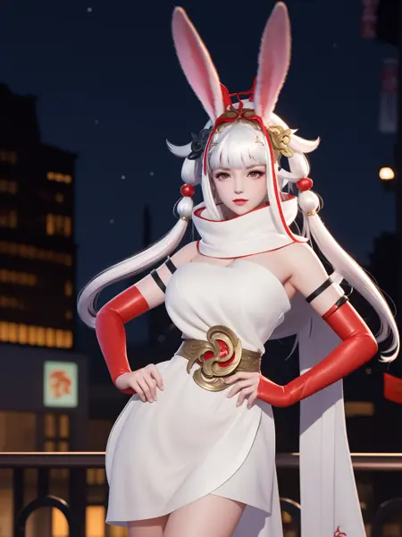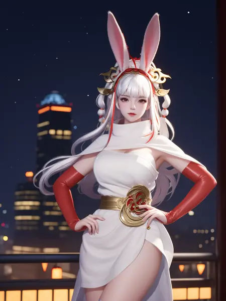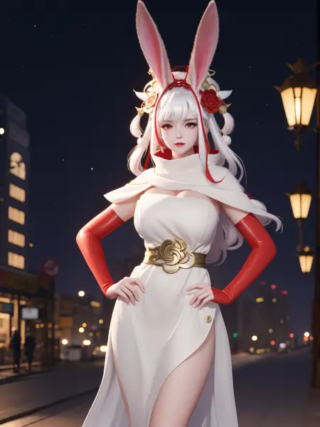 - WZRYgongsunliQXLZ, 1girl, solo, white hair, rabbit ears, long hair, looking at viewer, hair ornament,red eyes, makeup,elbow gloves,jewelry,cityscape, night,mature female, standing, hand on hip, cowboy shot,