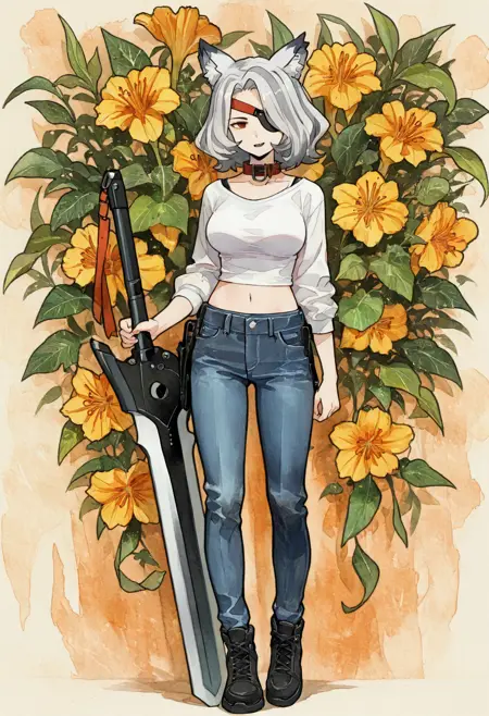 An unremarkable LoRA for an unremarkable mercenary. Made to test civitai's Illustrious trainer with a very small dataset. Slightly overfitted, especially when using the trigger word, so it's best at middle weights and if you only prompt for grey hair, animal ears, and the eyepatch. Mileage may vary with the sword.