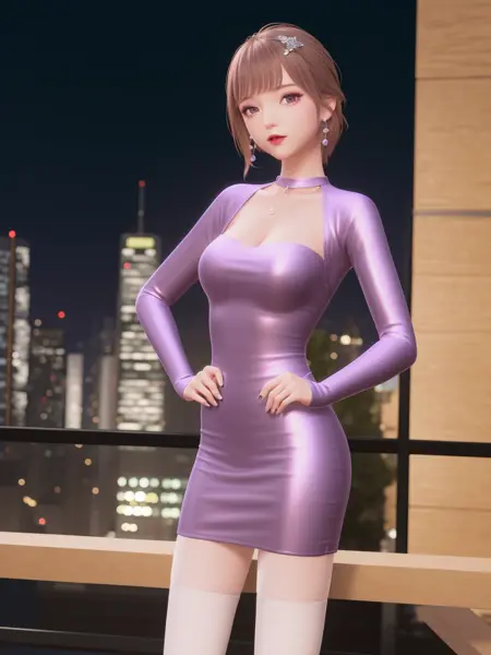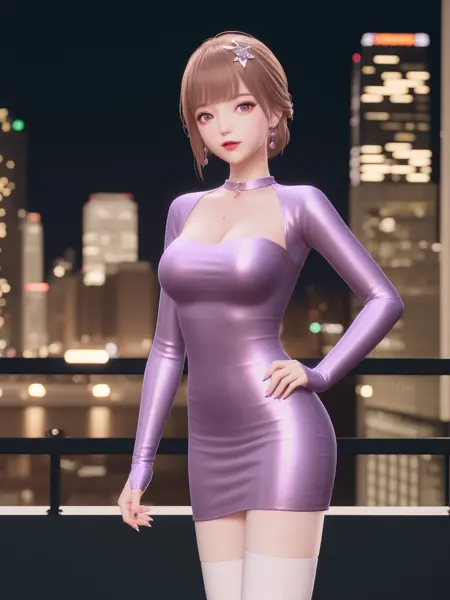 - SYNNmimengye, 1girl, solo, jewelry,purple eyes, brown hair, earrings, breasts,white thighhighs, necklace,hair ornament,bangs, short hair, long sleeves, purple dress, cityscape, night,looking at viewer, mature female, hand on hip, obesity,