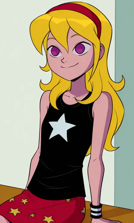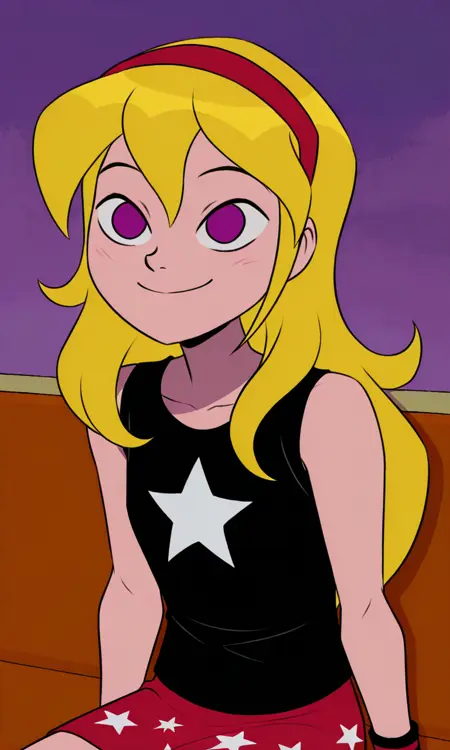 Lucy_mann, 1girl, solo,blonde hair, long hair,purple eyes, red hairband,black shirt, sleeveless shirt, star(symbol), star print, wristband ,red skirt, flat chest,upper body,smile