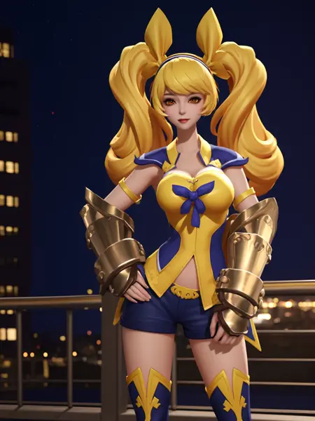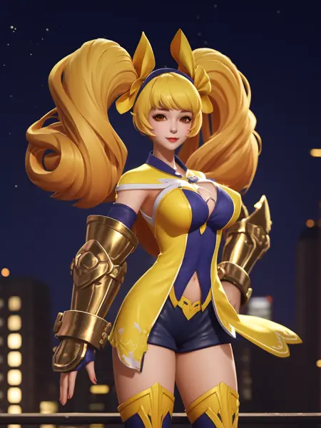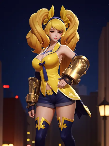 - WZRYsunshangxiangHPQJ, 1girl, solo, thighhighs, twintails, long hair, blue shorts, blonde hair, gauntlets, boots, looking at viewer, red eyes, breasts, standing, hand on hip, dress, hair bow, cityscape, night, mature female, light smile,