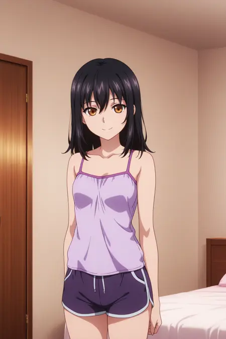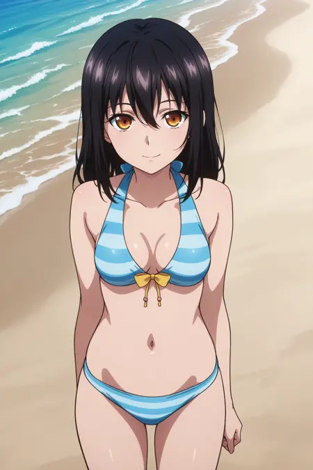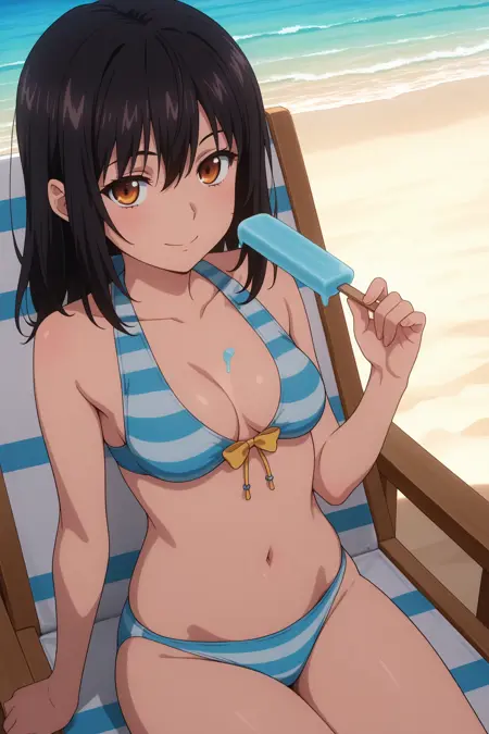 aayukina, 棕色眼睛, 黑色头发, 泳装, 条纹比基尼, 蓝色比基尼, 吊带式, 蝴蝶结比基尼, 前系带上衣, 动漫上色,
