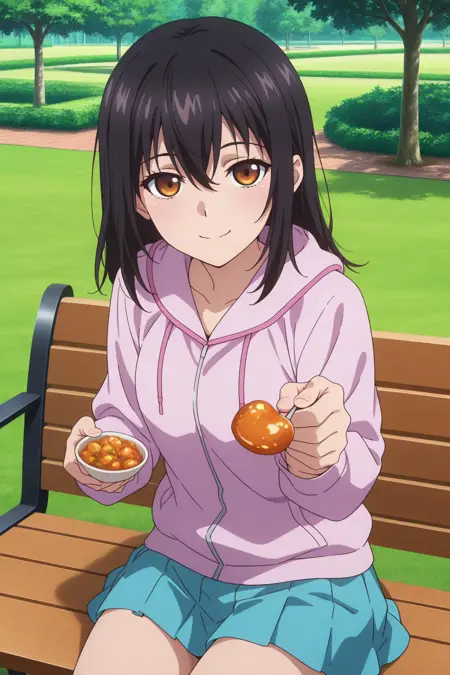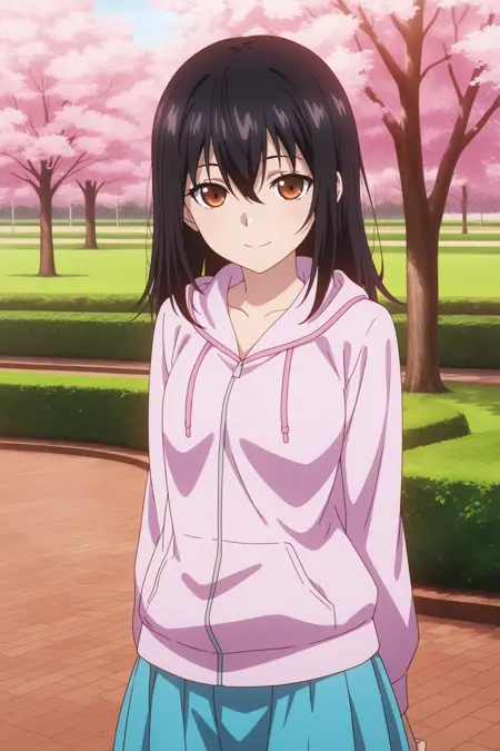 aayukina, 棕色眼睛, 黑色头发, 粉色连帽衫, 连帽毛衣, 帽子下垂, 水蓝色裙子, 百褶裙, 动漫上色,