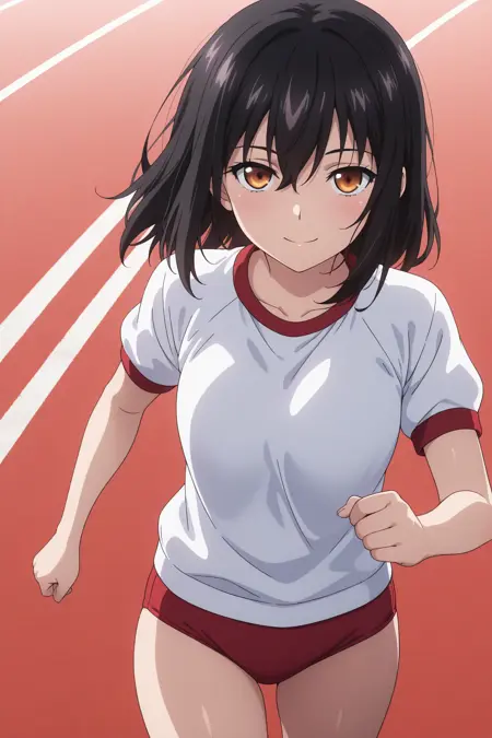 aayukina, 棕色眼睛, 黑色头发, 运动服, 白色衬衫, 运动衫, 短袖, 红色 buruma, 动漫上色,