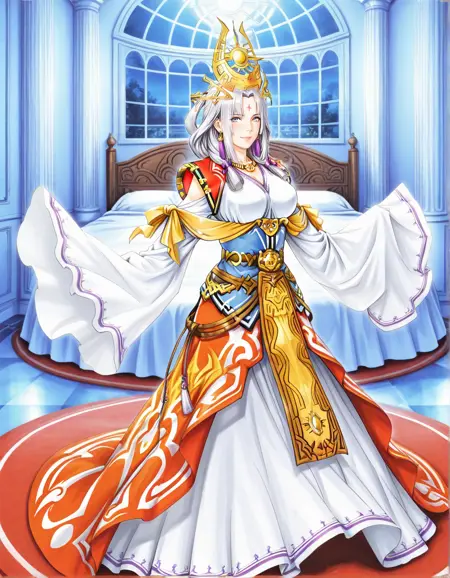 판타지 왕실 복장, 화려한 드레스, 빨간 띠, 화려한 금 벨트, 흐르는 듯한 넓은 소매,
