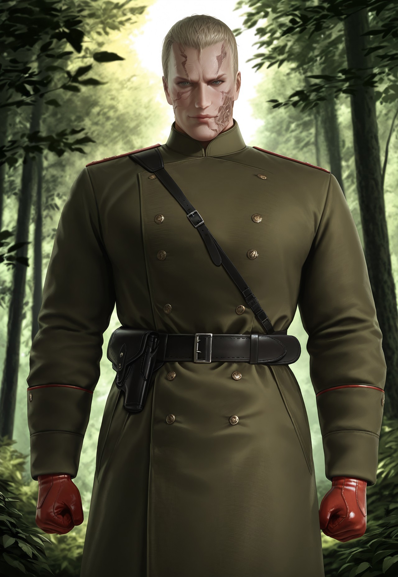 Snake Eater(代替): MGS Volgin、緑がかった灰色の目、金髪の灰色の髪、短髪、顔の瘢痕、顔の火傷、筋肉質、腕の瘢痕、赤い軍服、弾帯、弾薬ベルト、赤いレザーブーツ