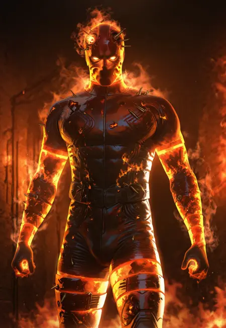 The Phantom Pain(火の人): MGS Volgin、火の人、発光、燃焼、筋肉質、黄色い目、発光する目、マスク、頭部に貫通した弾丸、体に貫通した弾丸、焼けた赤い軍服、焼けたブーツ