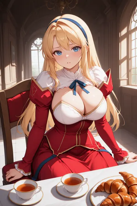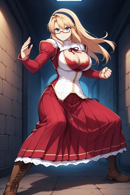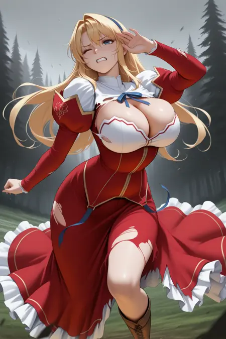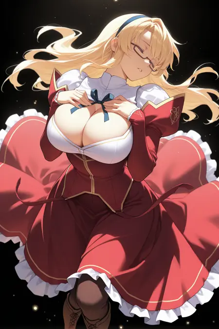 彼女のオリジナルの外見には、「白い襟、赤いドレス、ロングドレス、フリル付きドレス、ネックリボン、ふんわりした袖、赤い袖、胸元の切り替え、赤いアンダーバスト、茶色のブーツ」を追加してください。