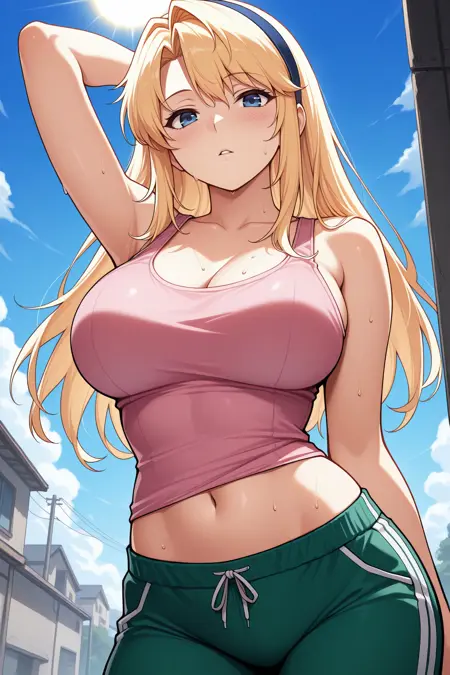 トリガー語は「satlzr」であり、「金髪、ロングヘア、青い目、髪留め」は必須です。