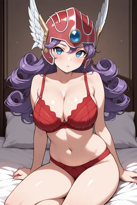 Add "winged helmet, white choker, bikini armor, red armor, shoulder armor, red gloves, arm warmers, thigh strap, red boots" for her typical look.