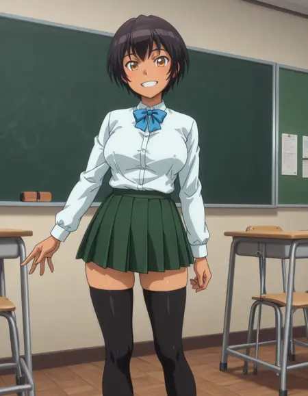 彼女の普段の服装:白いシャツ、緑のプリーツスカート、青いリボンタイ、タイツ
