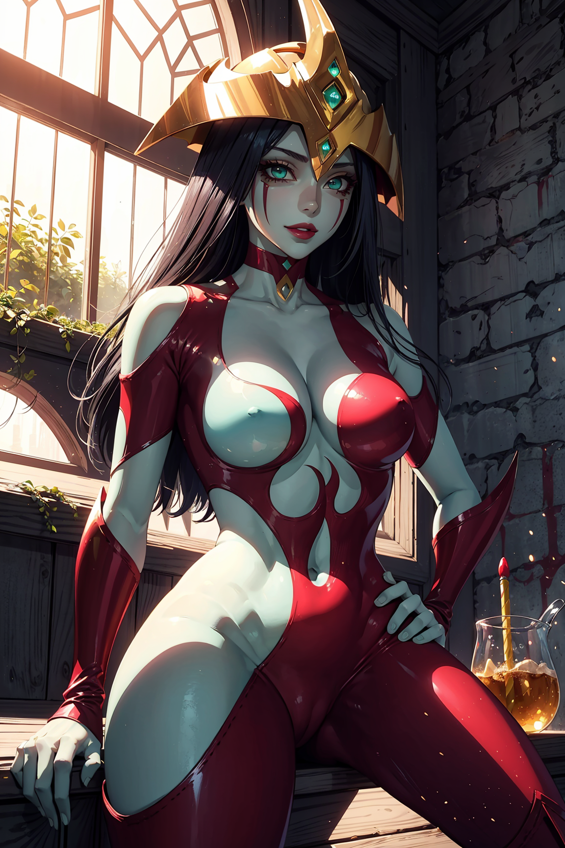 태그: elemental hero burstinatrix, 1girl, bodysuit, colored skin, helmet, lipstick, green eyes