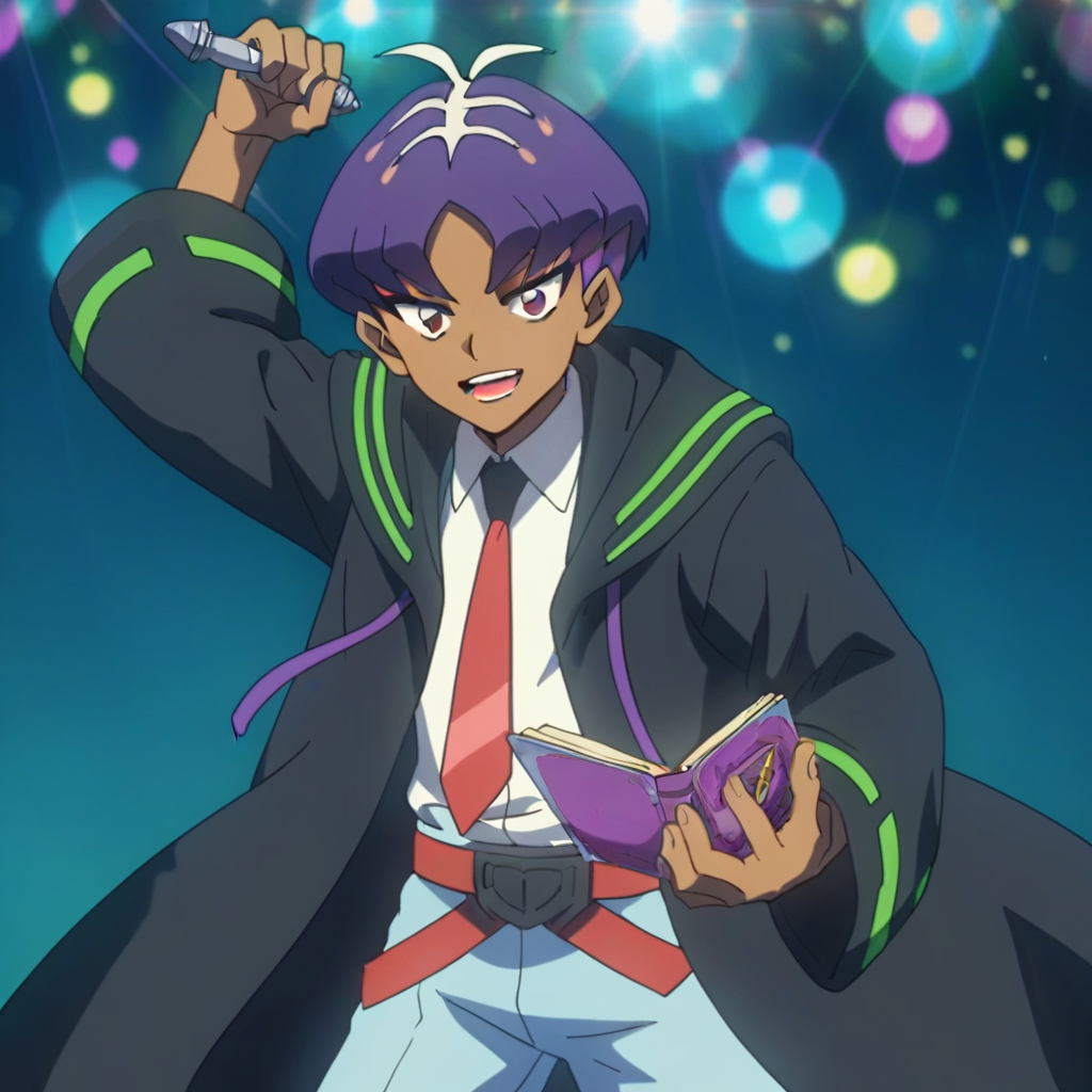 提示:男性,深色皮肤,多色头发,三色头发,紫色头发,粉色头发,白色头发,天线头发,深红色眼睛,白色领衬衫,红色领带,黑色外套,兜帽,腰带,浅蓝色裤子,鞋子,手持,魔杖,法术书,卡片,室内(观景台/电梯),室外(城市/天空/建筑/砖墙),室外(屋顶/天空/云/栏杆),室外(森林/树/串灯/桌子/食物/标牌(物体)),室外(滑板公园),蓝色背景/闪光/气泡