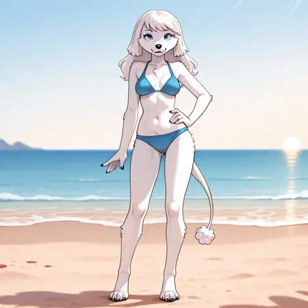 dog girl, poodle, white fur, white hair, long hair, blue eyes, black nose, dog tail, fluffy tail tip,