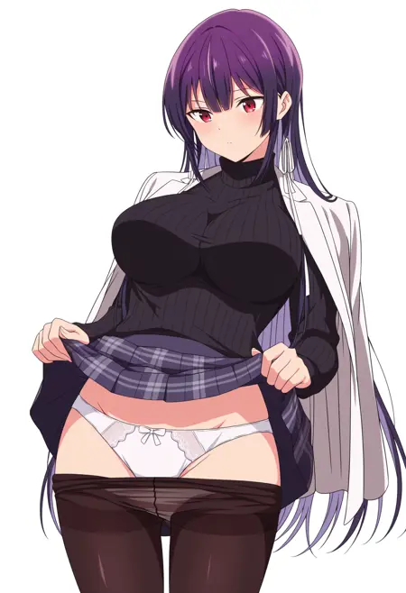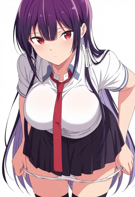 takamine_wz, very long hair, purple hair, hair ribbon, white ribbon, red eyes, large breasts, white shirt, collared shirt, red necktie, black skirt, pleated skirt, miniskirt, black kneehighs