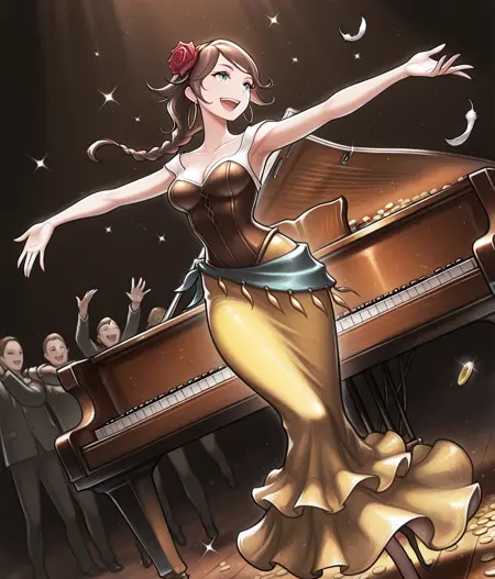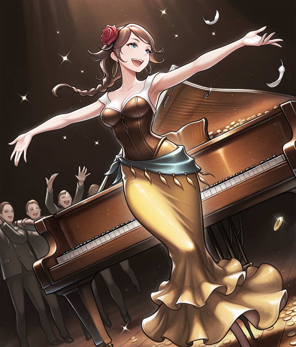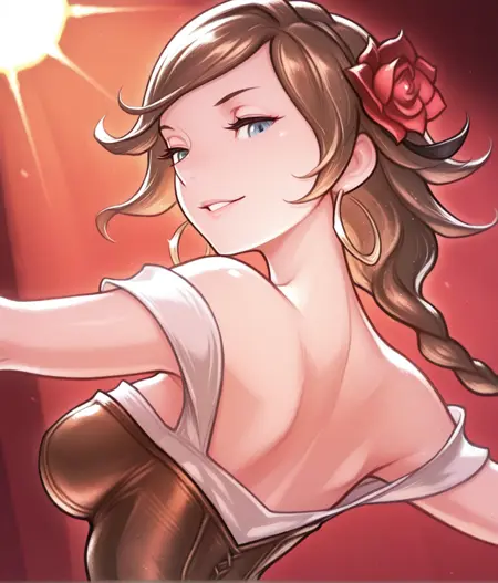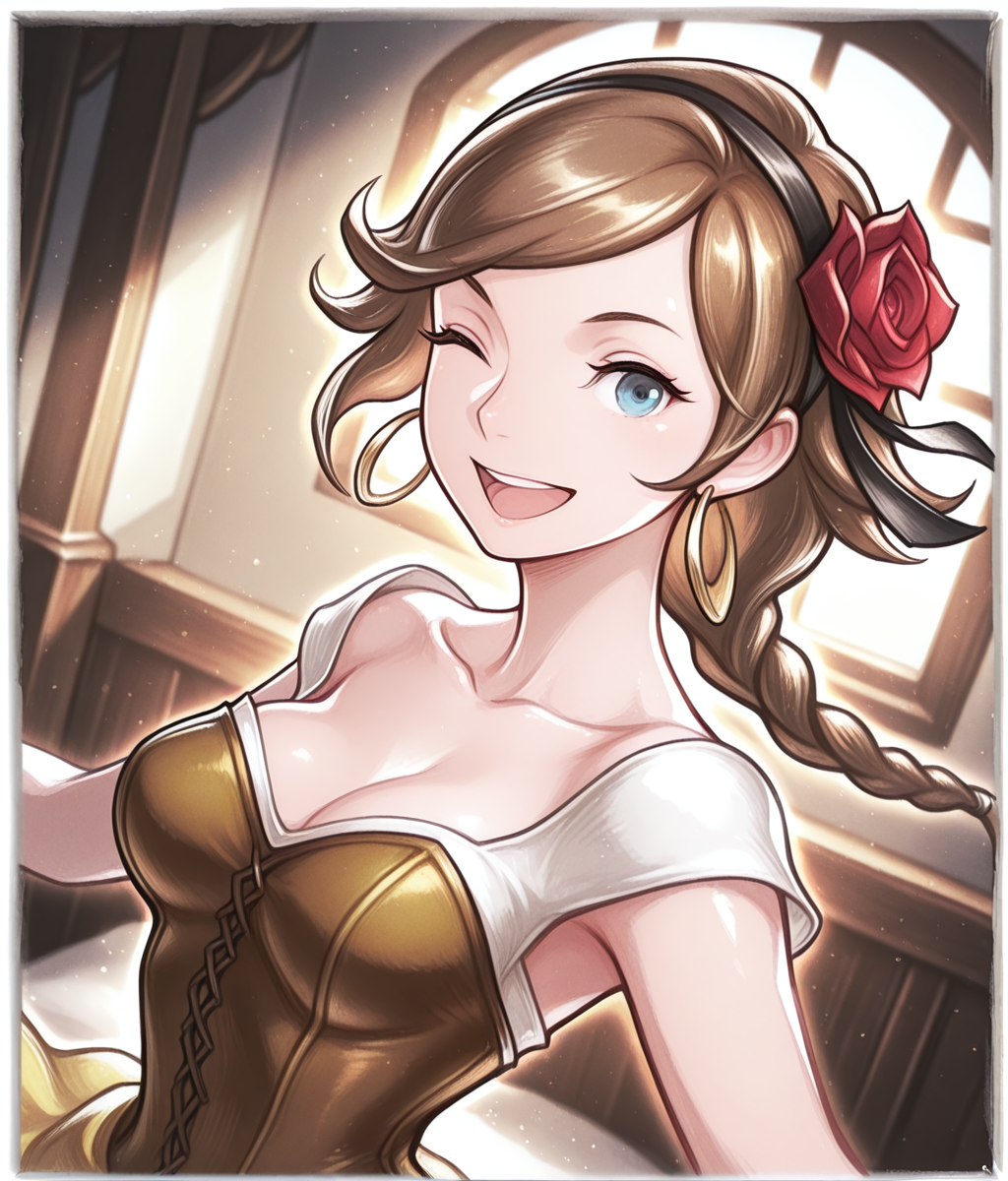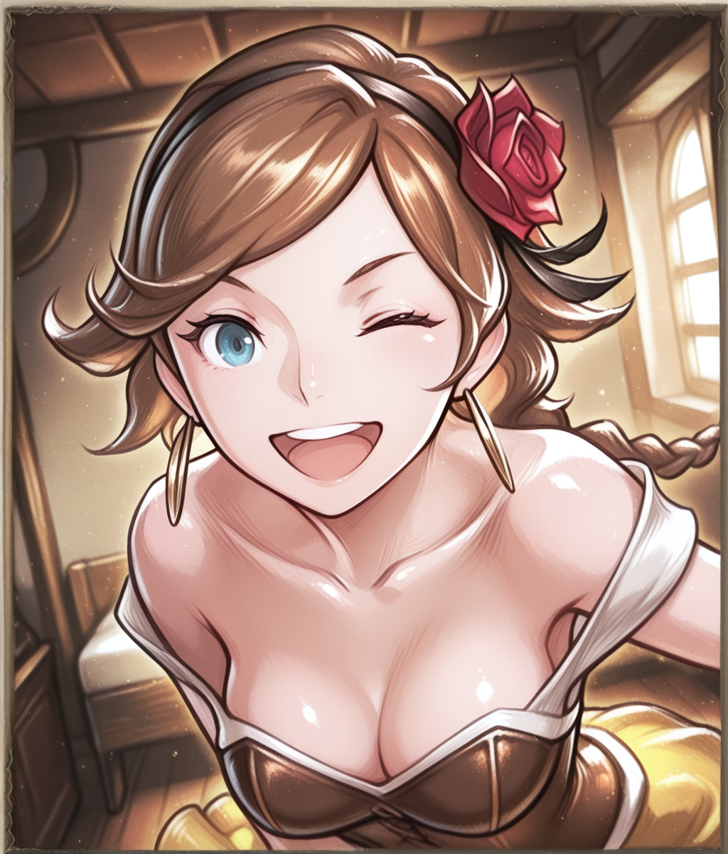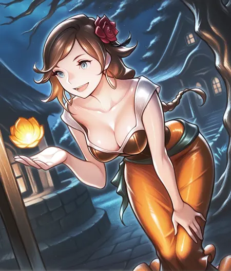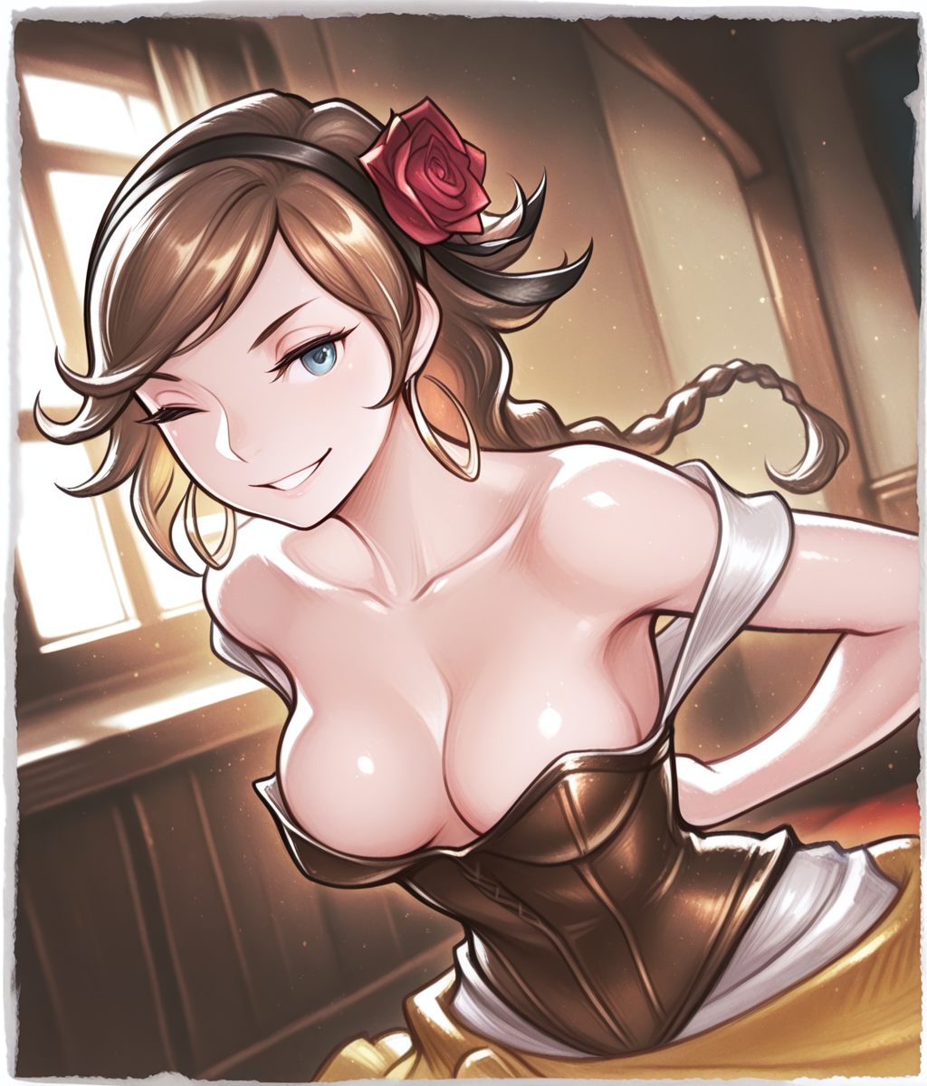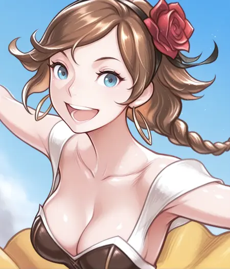 Outfit: hair red rose, black hairband, yellow skirt, long skirt, cleavage, jewelry, hoop earrings, high heels, white dress, brown corset