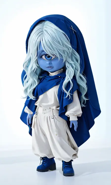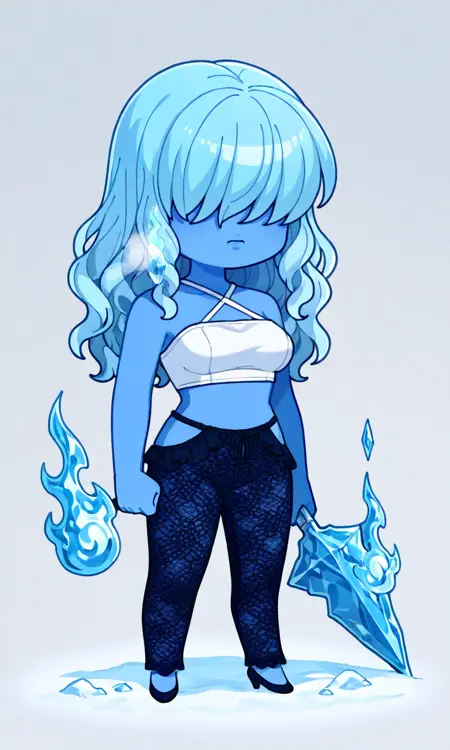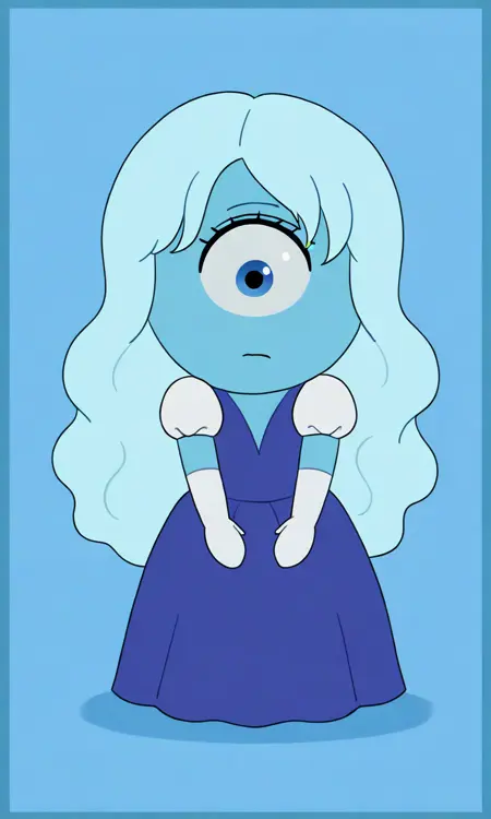 1girl,sapphire,chibi,blue theme,one-eyed,cyclops,hair over eyes,long hair,light blue hair,wavy hair,blue eyes,blue skin,blue dress,short puffy sleeves,white sleeves,long dress,blue border,white gloves,elbow gloves