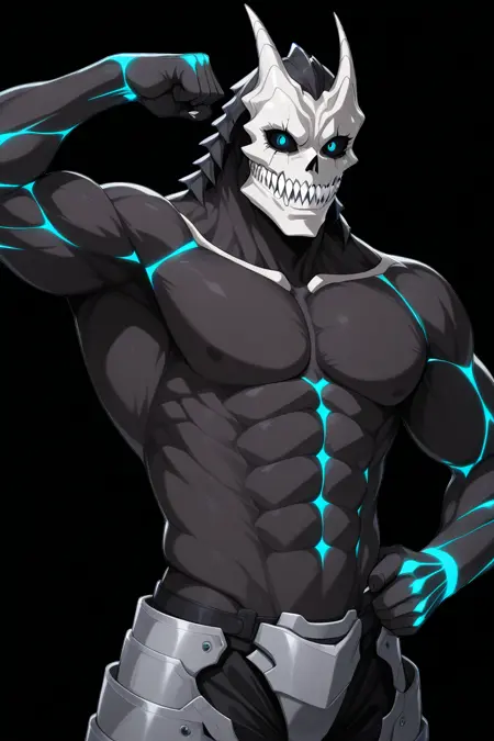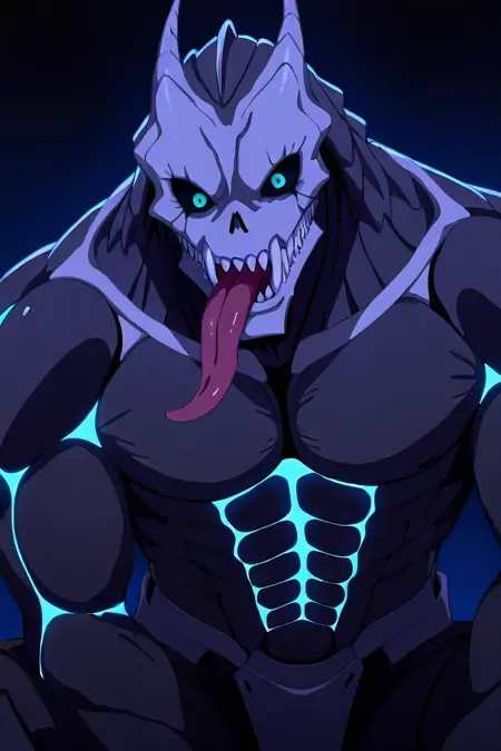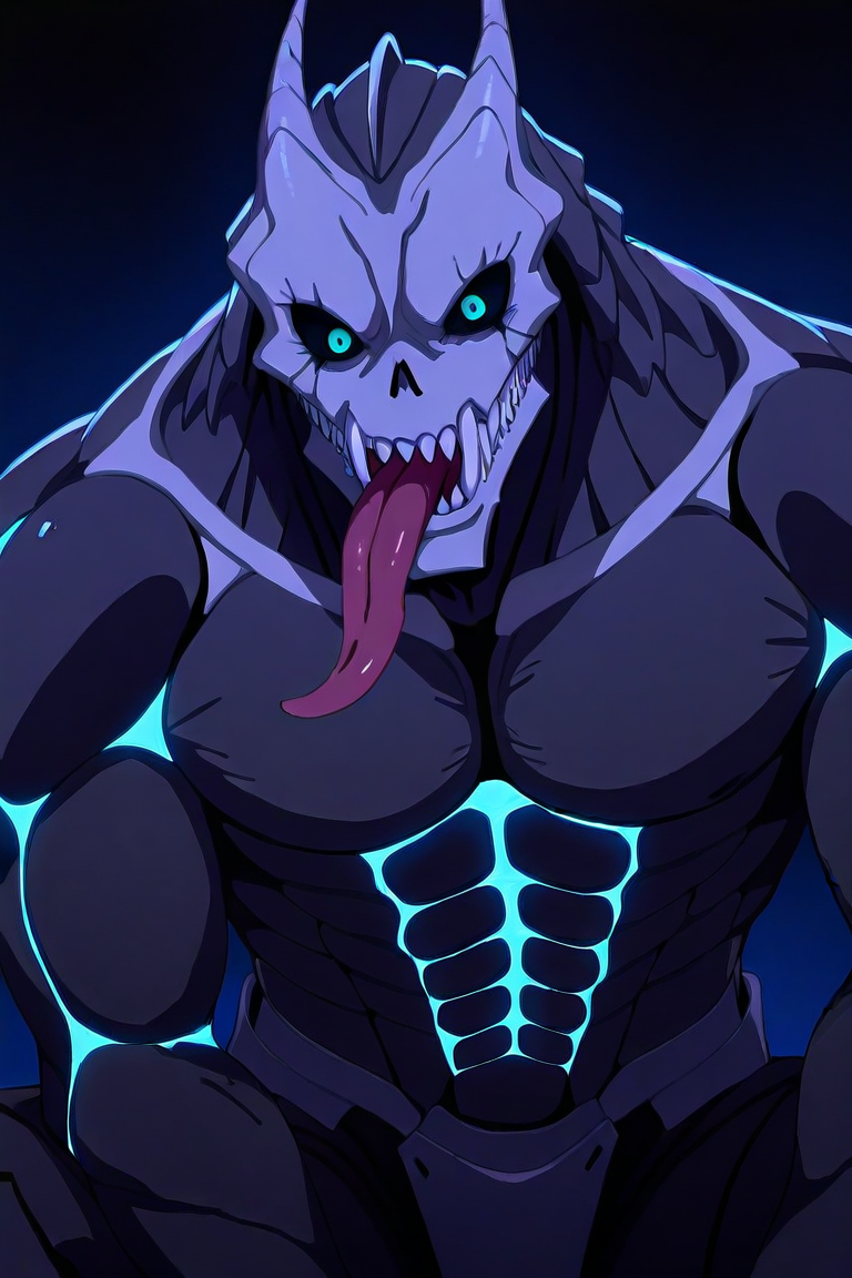 Kaiju No. 8,solo,male,Kaiju,adult,Head/Skull,black sclera,blue eyes,no eyebrows,sharp teeth,fang,Dark Skin,armor,External dorsal spine,Extremely long tongue