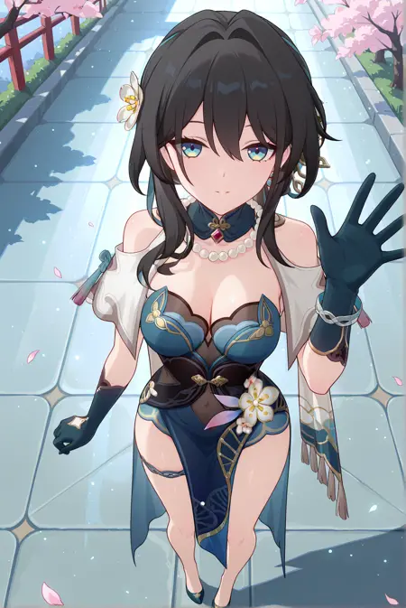 기본: ruan-mei, 1girl, 긴 머리, 청록색 눈, 검은 머리, 머리묶음, 머리장식, 눈에 핑크 톤
