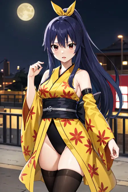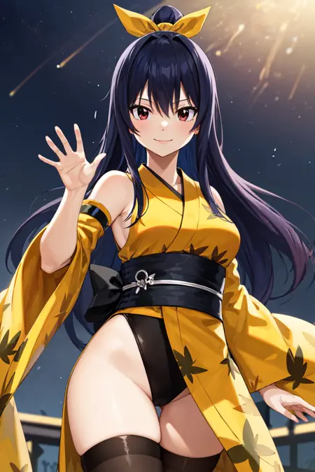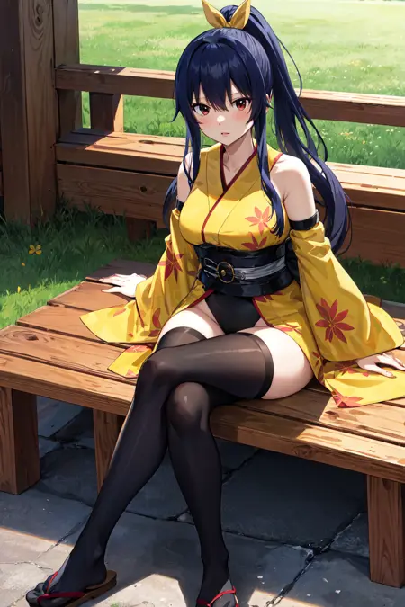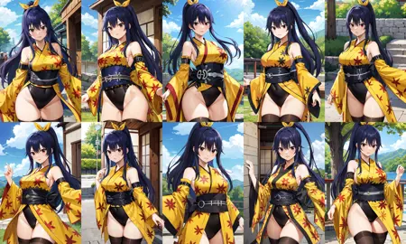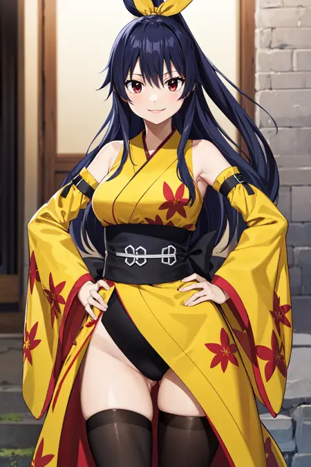 服装1aakogetsu, 长发, 马尾, 发带, 日本服饰, 黄色和服, 花纹图案, 分离式袖子, 腰带, 连体衣, 黑色过膝袜