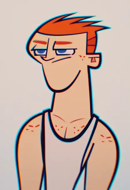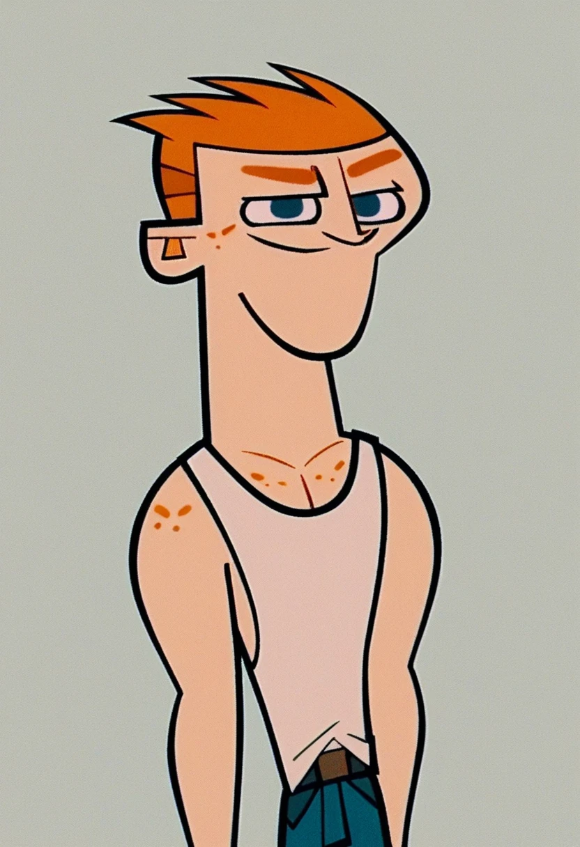ScottTDROTI, 1boy, slim yet fit body, orange slick-back hair, blue eyes, freckles, white tank top, blue jeans, black belt, brown sneakers