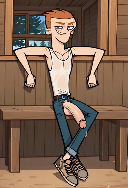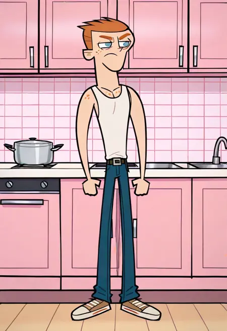 ScottTDROTI, 1boy, slim yet fit body, orange slick-back hair, blue eyes, freckles, white tank top, blue jeans, black belt, brown sneakers,