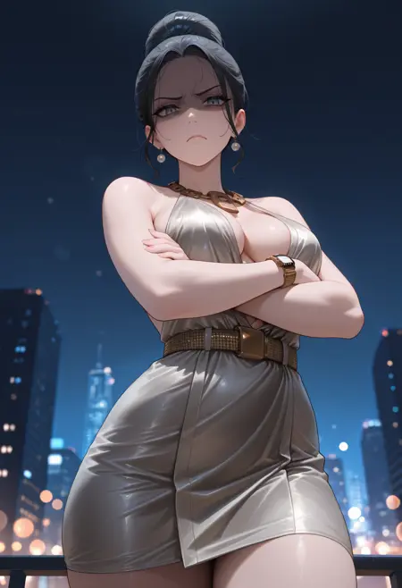 • 服装标签: 珍珠耳环,金项链,短裙,露肩裙,银色裙子,金腰带,手表,金色鞋履,高跟鞋