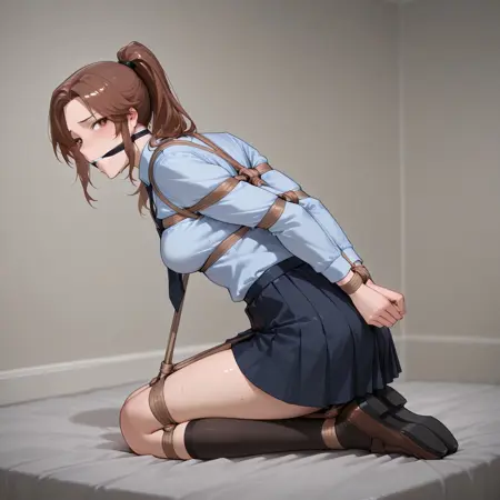 Suggested Prompt: Shibari, Knee to the chest, {Kneeling| Lying on side | Sitting}, {From Above| From behind | From Side},