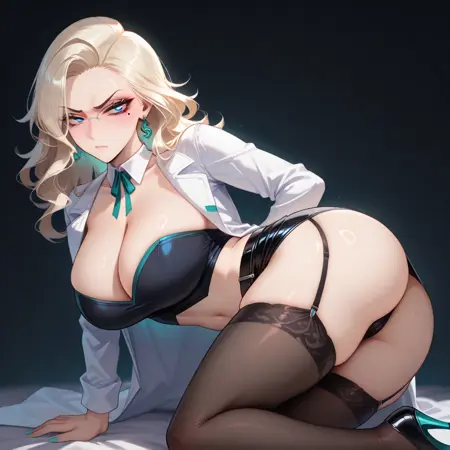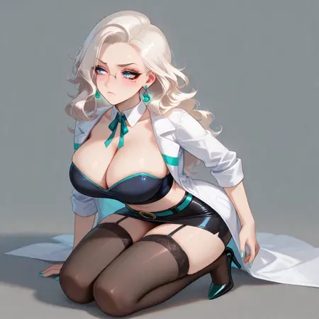 over-rim eyewear,lab_coat,detached_collar,neck_ribbon,black_crop_top,cleavage,strapless,midriff,black_skirt,miniskirt,belt,aqua_trim,garter_straps,black_thighhighs,high_heels,black_footwear,