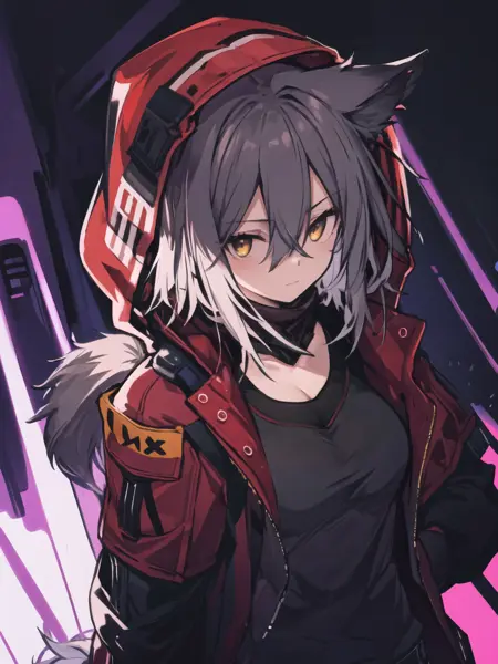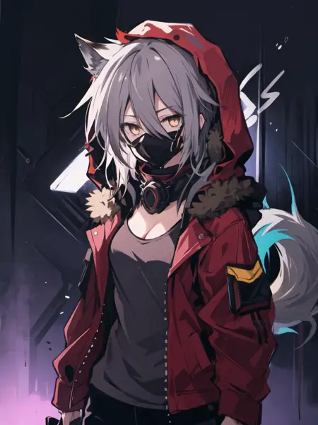 projekt red, bangs, shirt, long sleeves, hair between eyes, jacket, yellow eyes, grey hair, small breasts, boots, pants, hood, bag, black footwear, open jacket, fur trim, mask, black pants, wolf ears, hooded jacket, grey shirt, wolf tail, red jacket, cross-laced footwear, hood up, fur-trimmed hood,