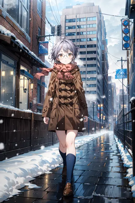 코트: 갈색 코트, 스카프, 무릎높이 양말