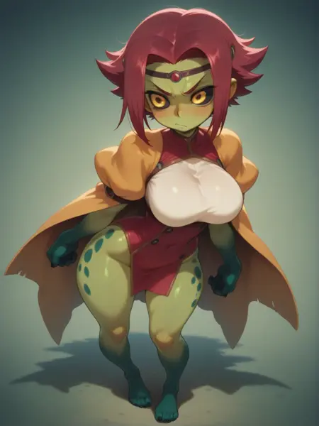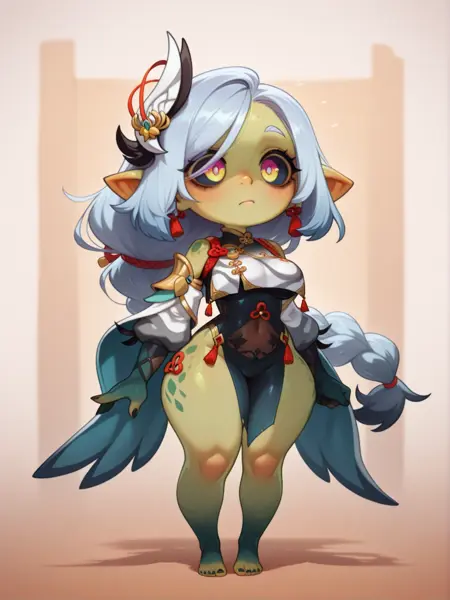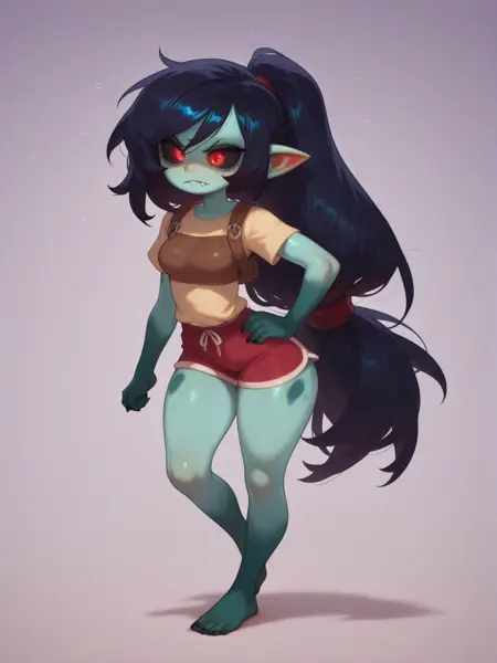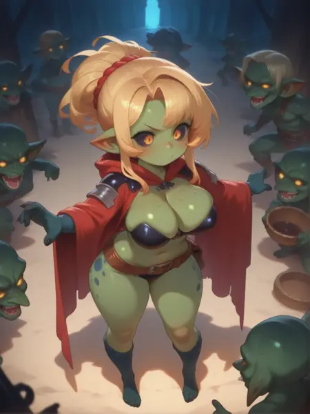 'Shortstack'은 LoRA에 완전히 내장되어 있지 않으므로, 더 낮고 뚱뚱한 고블린을 원하신다면 이 태그도 추가하세요! 원치 않는 남성 고블린이 나오면 'male goblin'을 부정적 태그에 넣으세요. 하지만 이는 소녀의 고블린 특성을 약간 희석시킬 수 있습니다.