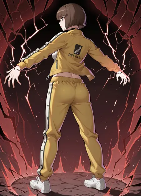 默认装扮:defkelly, 1girl, solo, 棕色头发, 波波头, 齐刘海, 棕色眼睛, 嘴唇, 中等胸部, 肚脐, O型项圈, 黄色夹克, 开襟夹克, 白色短上衣, 黄色裤子, 运动裤, 白色鞋履, 运动鞋,