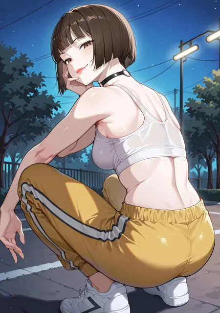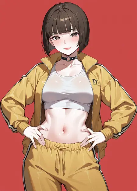 Default Outfit: defkelly, 1girl, solo, brown hair, bobcut, blunt bangs, brown eyes, lips, medium breasts, navel, o-ring chocker, yellow jacket, open jacket, white cropped top, yellow pants, track pants, white footwear, sneakers,