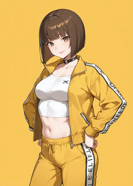 Default Outfit: defkelly, 1girl, solo, brown hair, bobcut, blunt bangs, brown eyes, lips, medium breasts, navel, o-ring chocker, yellow jacket, open jacket, white cropped top, yellow pants, track pants, white footwear, sneakers,