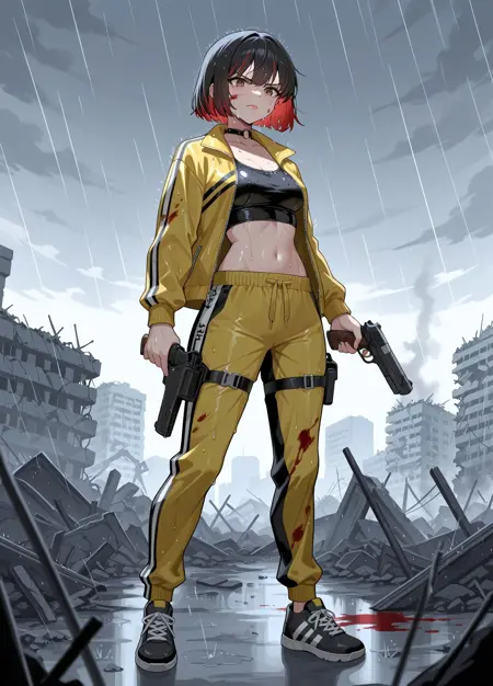 Awakening Outfit: awkelly, 1girl, solo, two-toned haircolor, black hair, red hair, short hair, brown eyes, lips, navel, blood on face, blood on clothes, o-ring chocker, yellow jacket, open jacket, black cropped top, yellow pants, track pants, writing clothes, holster, black footwear, sneakers,