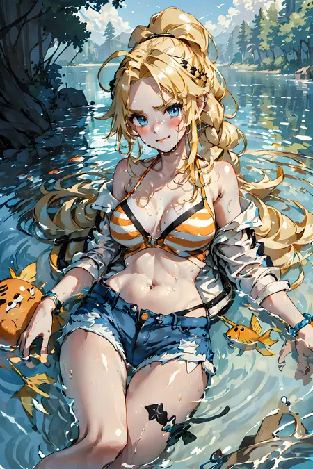 ビジャー帽、太ももストラップ、開きフライ、髪飾り、水着、縞模様のビキニ、オレンジ色のビキニ下着、ジュエリー、透明なジャケット、デニムショートパンツ