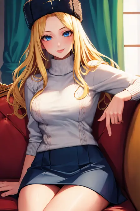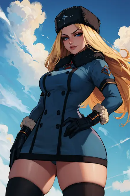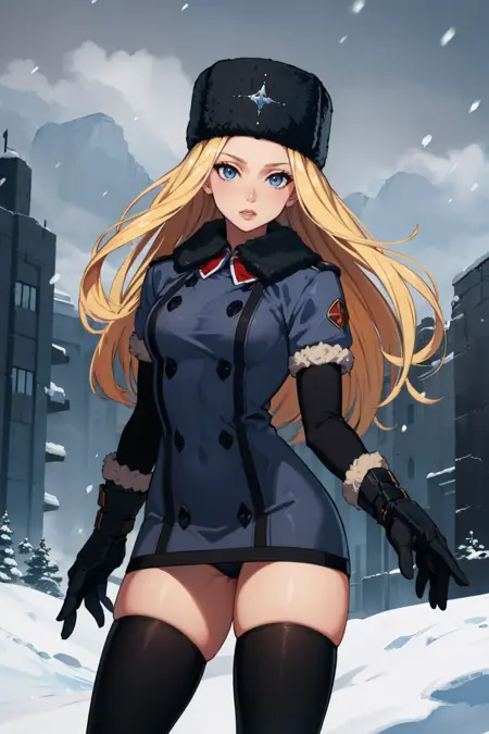 그녀의 전형적인 외모를 위해 "모직 모자, 검은 코트, 팔꿈치 장갑, 허벅지 긴 양말"을 추가하세요.