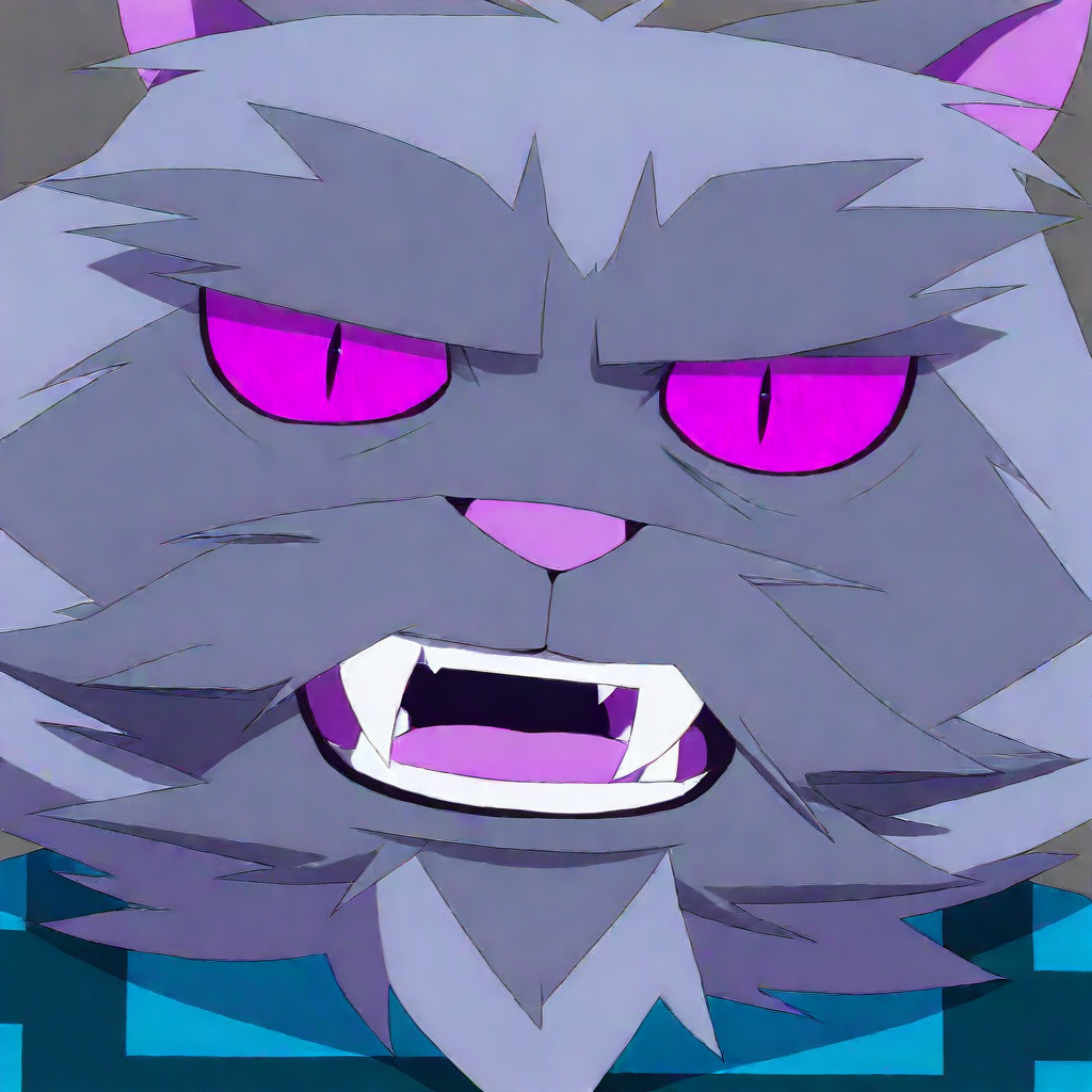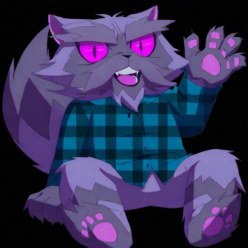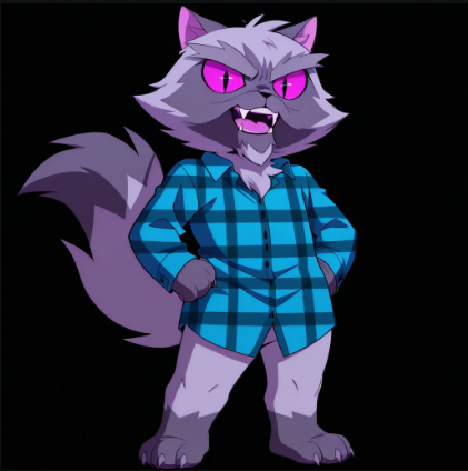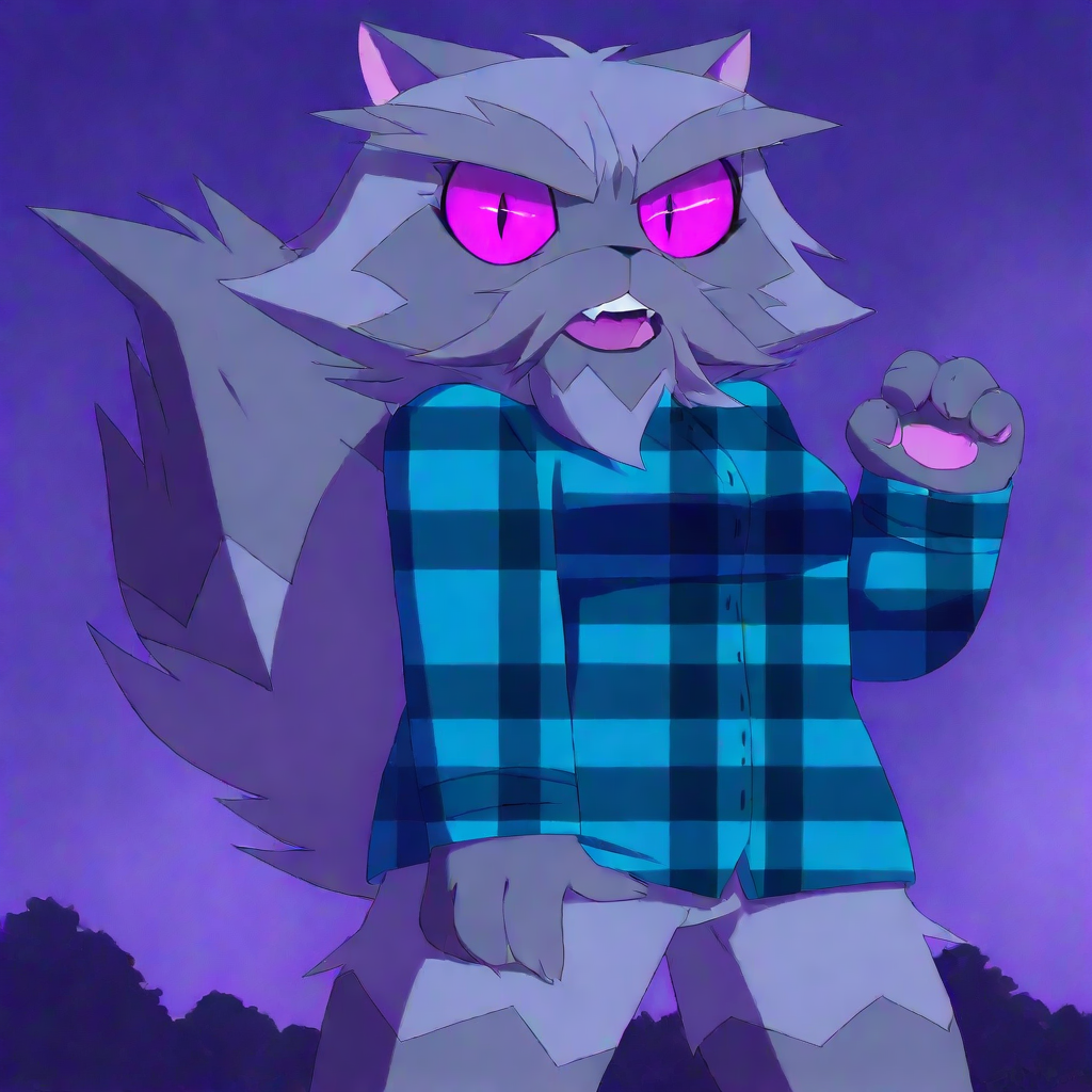 役立つプロンプト: 尖った歯、ひげ、口ひげ、灰色の毛、猫の目、青いチェックのフランネルシャツ